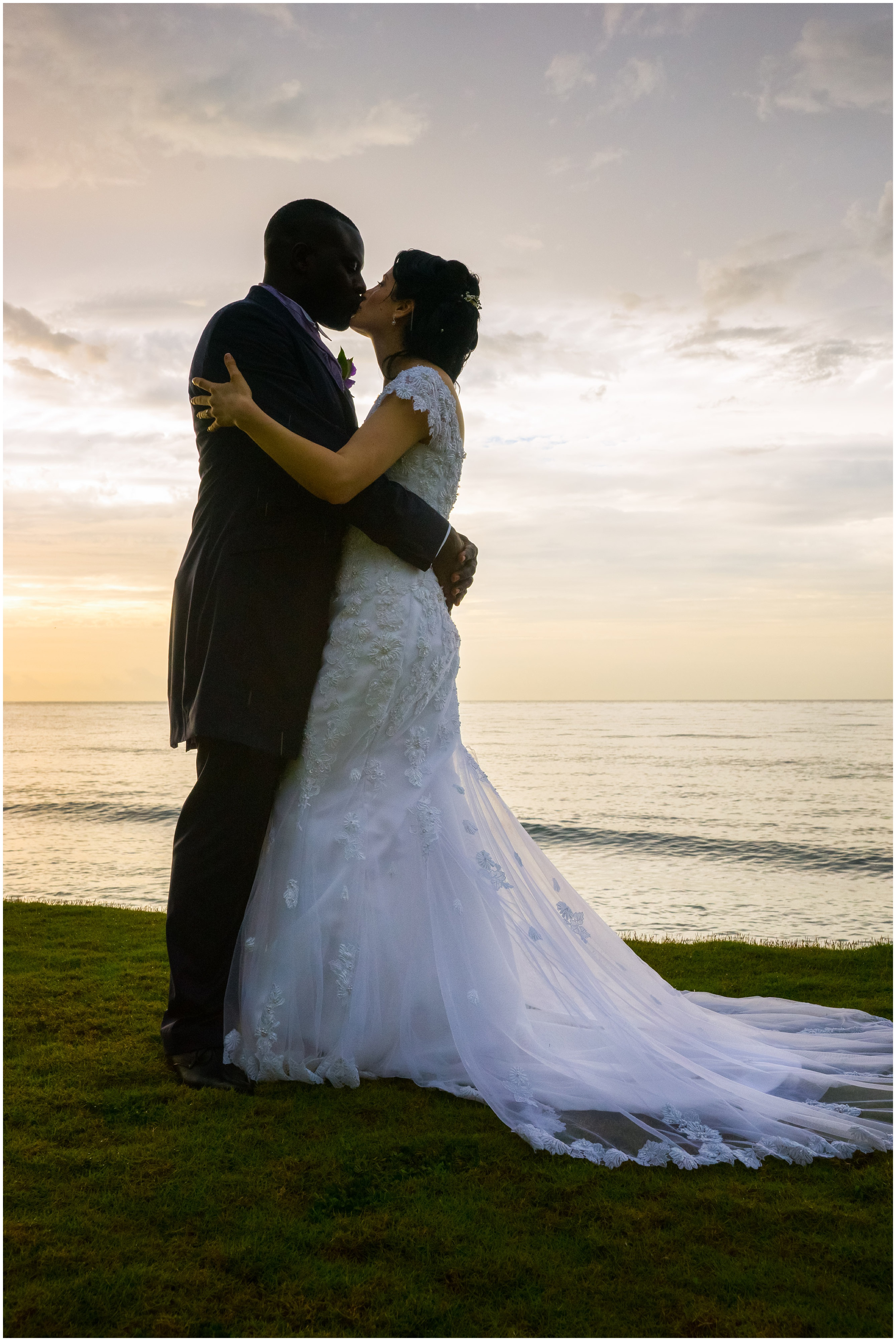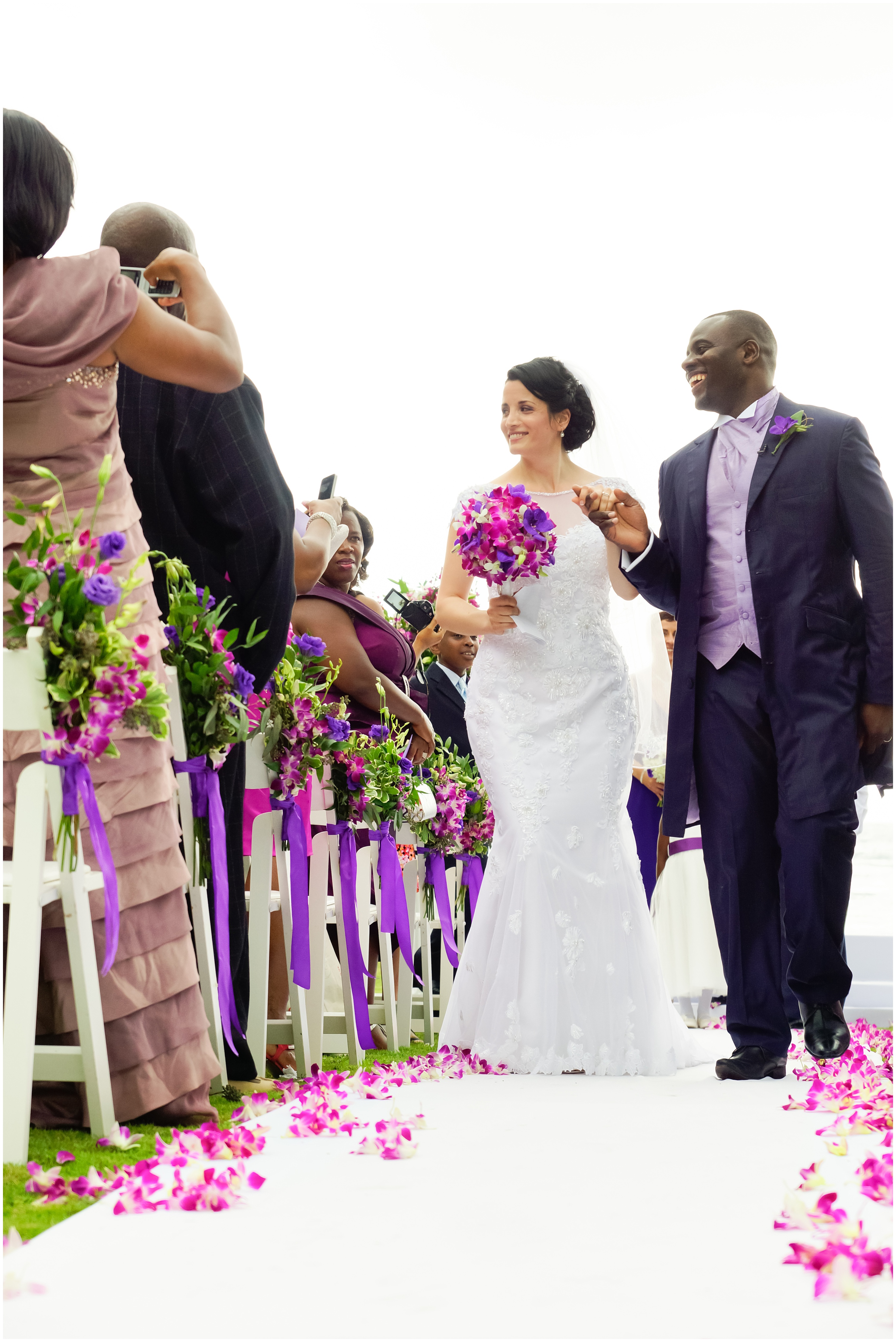 Mark and Ava chose to marry on the beautiful island of Jamaica as the groom grew up there as a child and had strong family roots, and with their desire to have a great location with a sea view Round Hill was a natural choice for their wedding. For a theme they chose the colours purple and white which was featured throughout their wedding with purple dendrobiums, purple spray roses and purple stock.